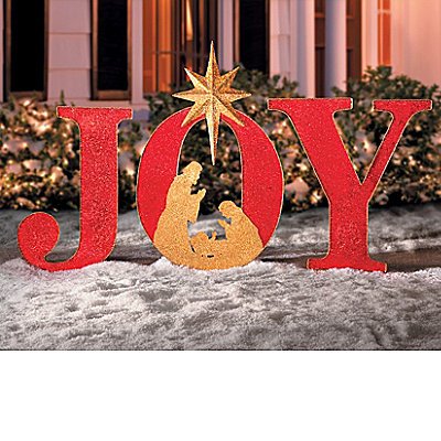 Glitter-coated Joy Nativity Sign Outdoor Christmas Decor Sturdy metal letters in rich red with gold trim stand up to 4' high The "O" features a silhouete of the Nativity scene with Bethlehem star above Includes stakes for easy outdoor setup Glittery design impresses both day and night; add spotlight for a dazzling night display