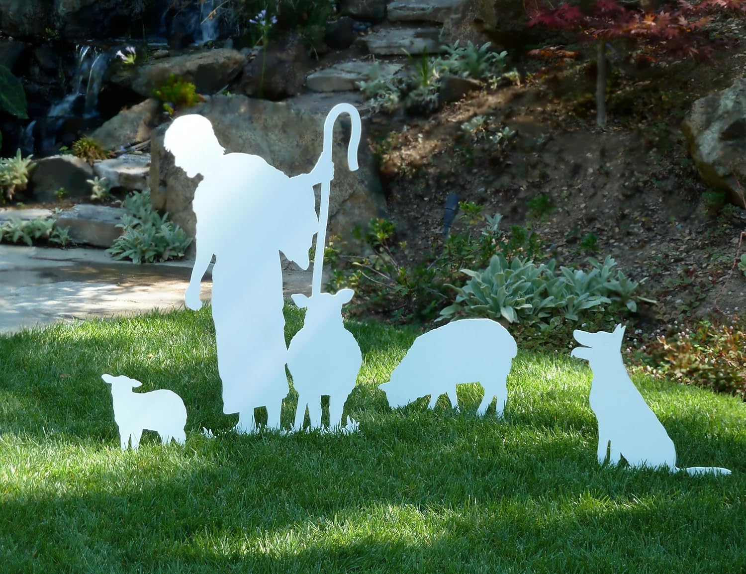 Includes 3 white outdoor nativity set figures and support stakes Dimensions: Shepherd: 11″ wide x 36″ high; Sheep: 12″ wide x 10″ high; Sheep: 13″ wide x 14″ high Made of all-weather, fade-resistant PVC plastic; Crafted in California, USA Designed to withstand rain, snow, harsh sunlight, and strong winds Add to Outdoor Nativity Store's Silhouette Outdoor Nativity Set - Holy Family Scene
