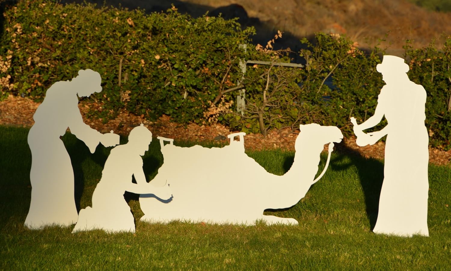 This beautifully designed and detailed outdoor nativity set silhouette will touch your heart at every glance. It is the perfect display to celebrate Christ's birth and share that joy with your neighbors. This outdoor nativity set is made in the USA of the highest end, UV protected, solid PVC sheets available. Assembly is quick and easy. Most people don't even look at the instructions. It ships in a custom designed box that can be used to store your nativity between the seasons. Size options -Medium: 47" wide x 42" tall x 11.25" deep -Large: 66.75" wide x 60" tall x 16" deep -Life Size: 102" wide x 92" tall x 22" deep Large size outdoor nativity set includes the manger, star, Mary and Joseph, and lamb. (Note, other characters are available and sold separately. Please match your additional characters to the size of your MyNativity Outdoor Nativity Scene.)