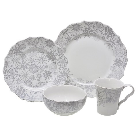 Enjoy the magic of winter all season long with the Snow Flurry Dinnerware Set. The whimsical snowflakes and scalloped edging are perfect for an elegant holiday meal or a casual gathering of friends. Made of dishwasher safe china so cleanup is quick and easy. Number of Pieces: 16 Includes: Dinner Plates, Bowls, Salad Plates, Mugs Service for: 4 Material: Fine China Care and Cleaning: Microwave Safe, Dishwasher-safe